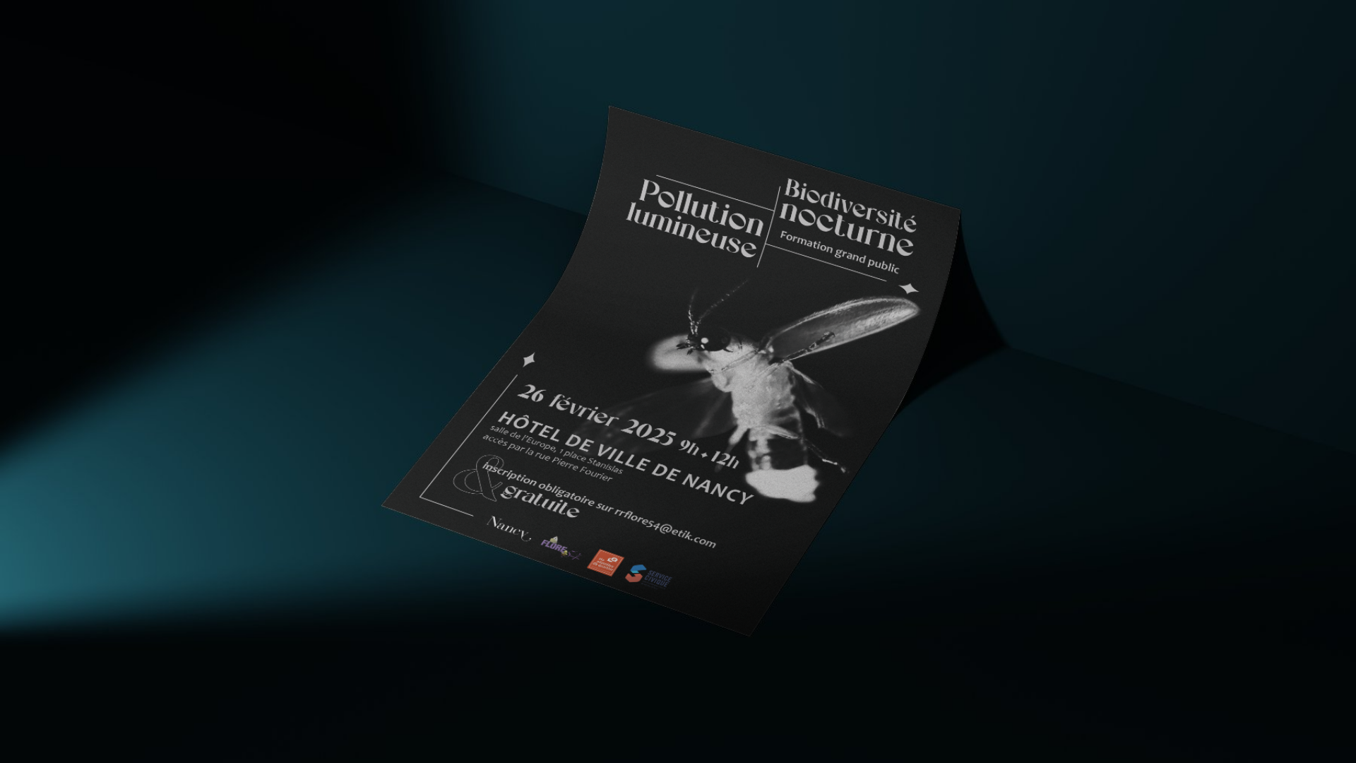 Pour le flyer, j’ai conservé le même univers graphique, mais en mettant en avant une luciole, symbole d’insecte nocturne capable de voir dans l’obscurité tout en produisant sa propre lumière. Ce choix visait à apporter davantage de clarté et de lisibilité au support.