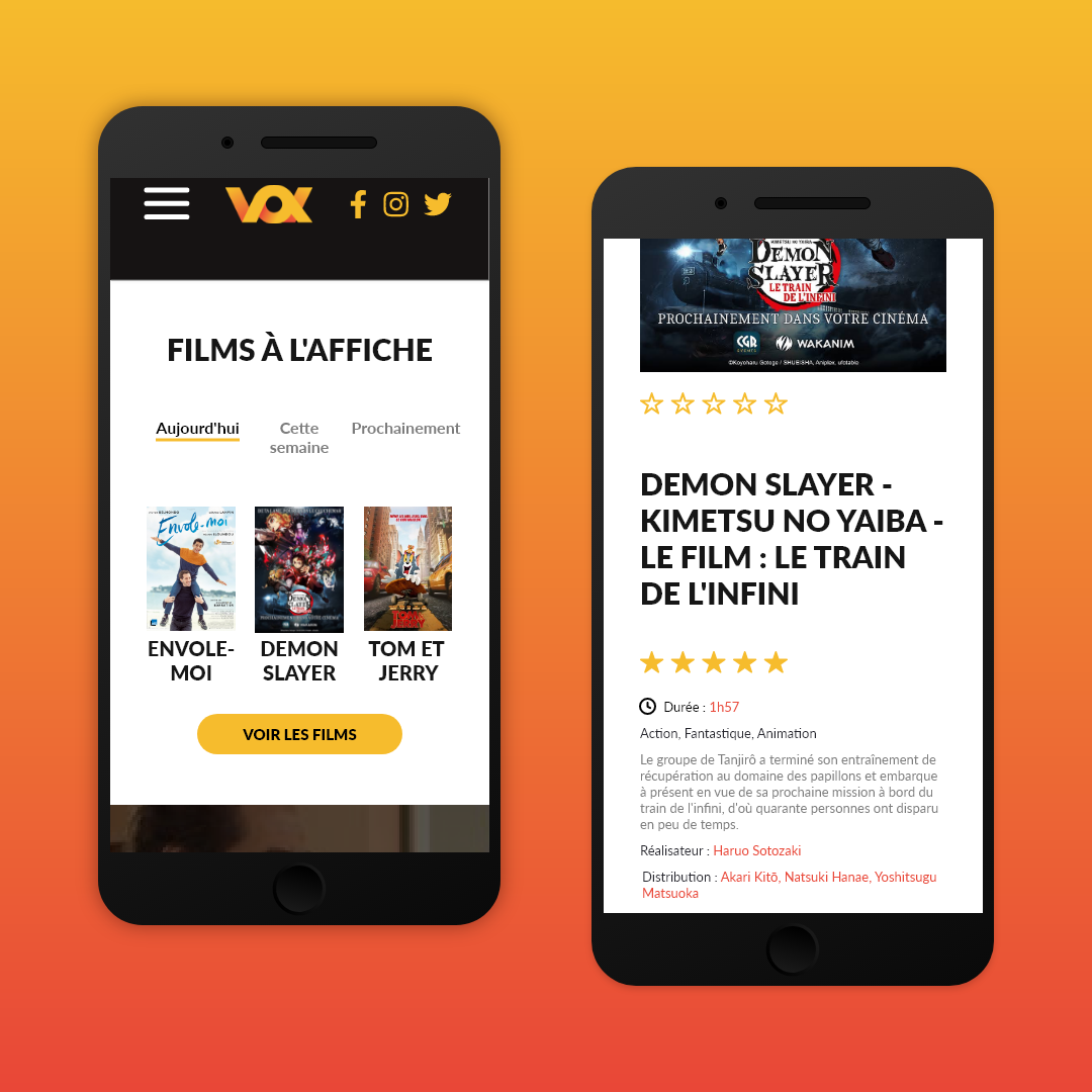 Concernant le design du site Vox, j'ai opté pour un thème dominé par les teintes orange et jaune, en accord avec les couleurs du logo, auxquelles j'ai ajouté du noir pour créer des contrastes entre les différentes sections du site.