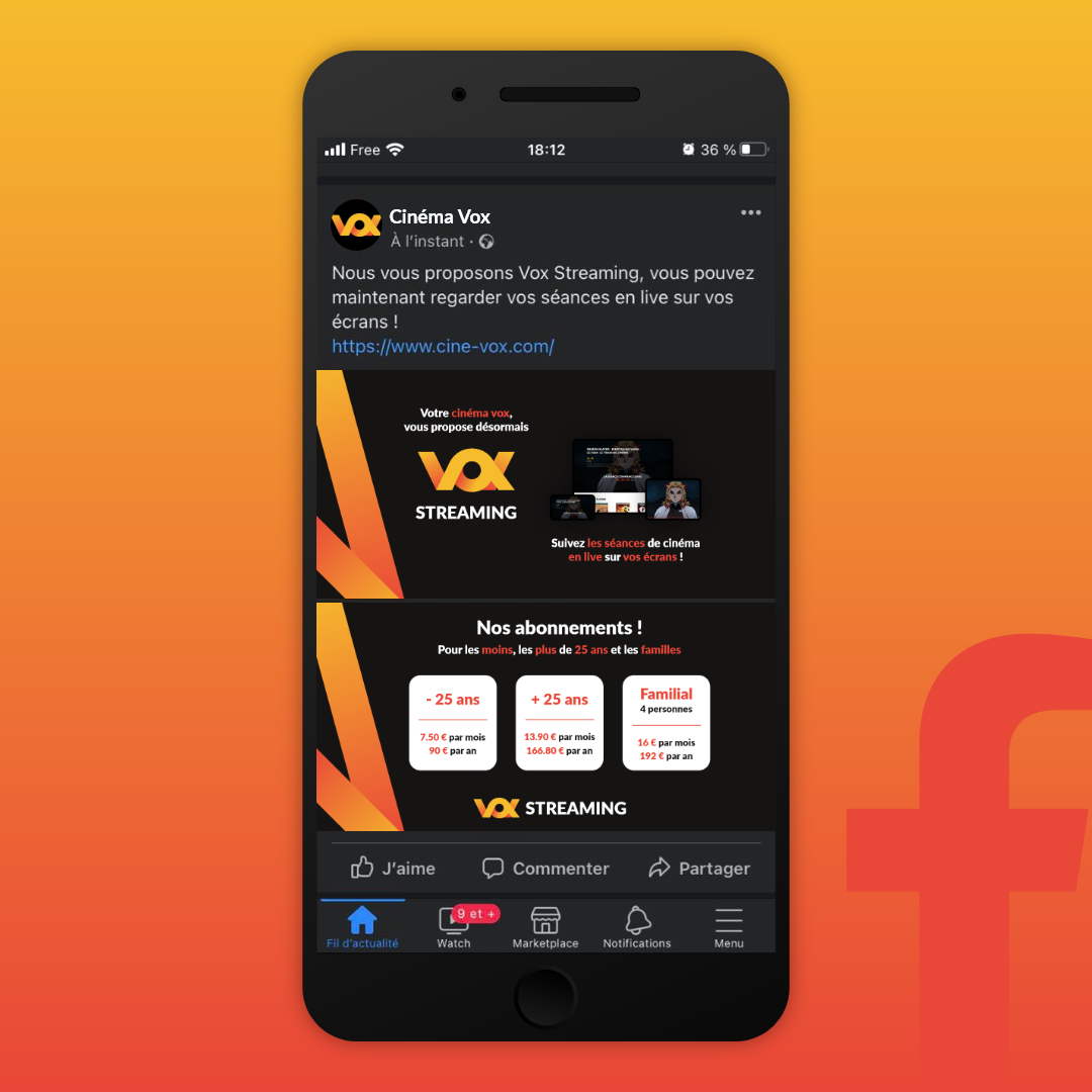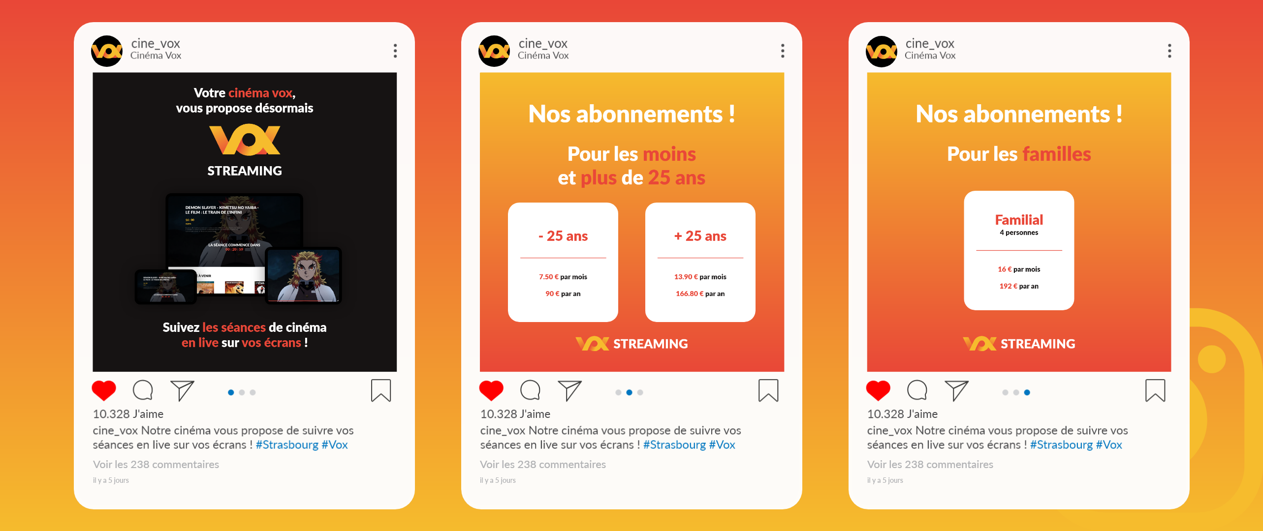 La campagne marketing avait pour objectif de promouvoir ce nouveau concept via les réseaux sociaux utilisés par Vox, j’ai donc conçu un kit de communication (Instagram, Facebook, X) ainsi qu’une affiche de prévention Covid-19, en cohérence avec la charte graphique.
